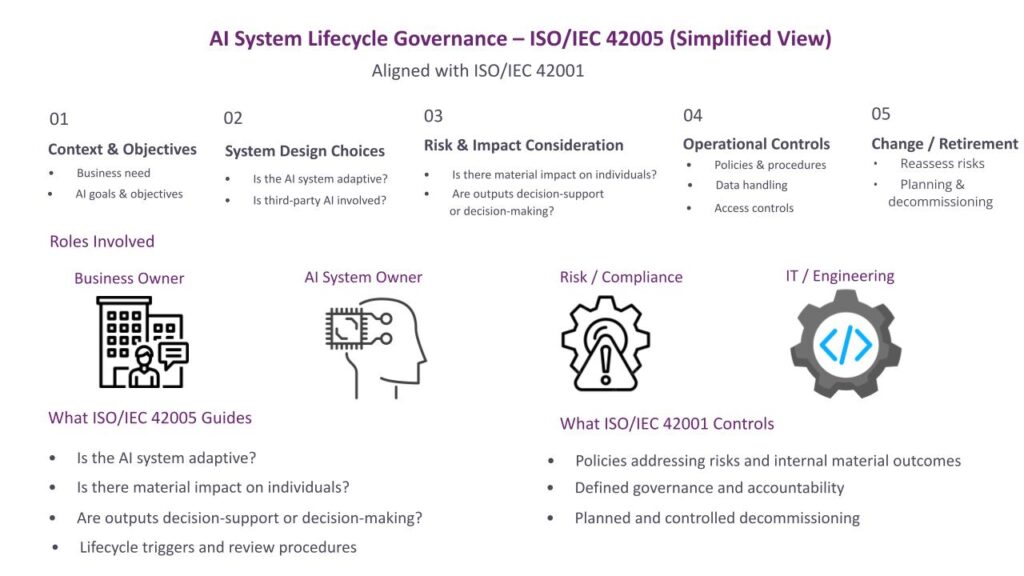 ISO 42001 is a management system standard. It expects defined accountability, controlled processes, and measurable performance.