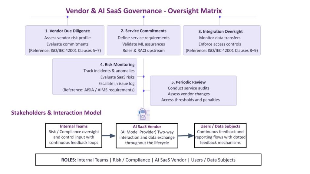 Caption: “Lifecycle governance view aligned with ISO 42001.” - Vendor & AI SaaS governance oversight matrix